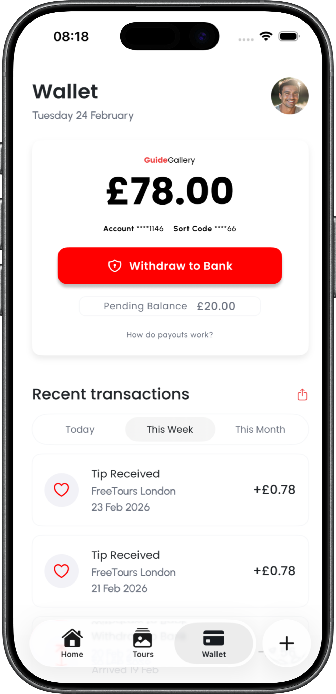 Track earnings in your app wallet and withdraw to your bank account for free. Instant UK bank payouts.